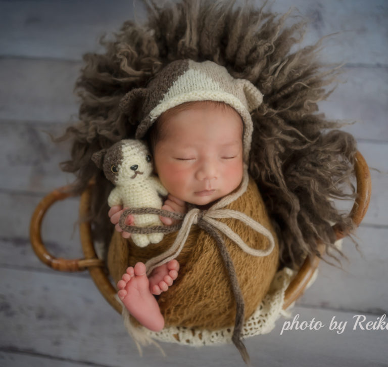殆どの新生児の赤ちゃんが好きなポーズです。 背景はグリーンの他、ホワイト、ブラック、ワインレッド、ピンク、ライ …